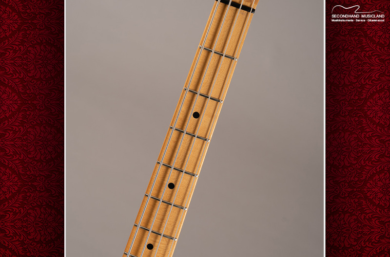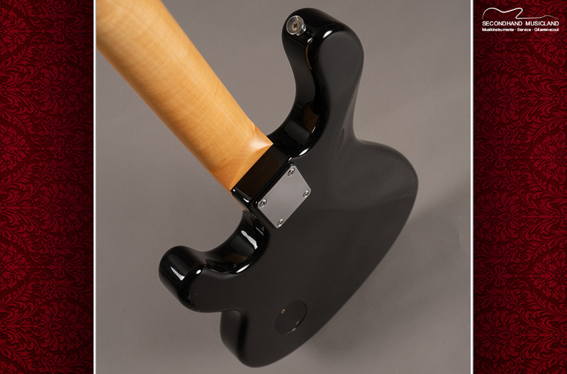 Wie bei dem Original besteht der massive Body aus Esche und der Hals aus Ahorn. Aus dem schwarzen Schlagbrett heraus ragt das Herzstück dieses Instruments, der Humbucker. Dessen Klang wird über die